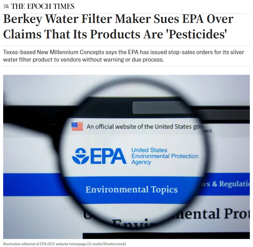 Read the article (click link) The Epoch Times: Berkey Water Filter Maker Sues EPA Over Claims That Its Products Are ‘Pesticides’